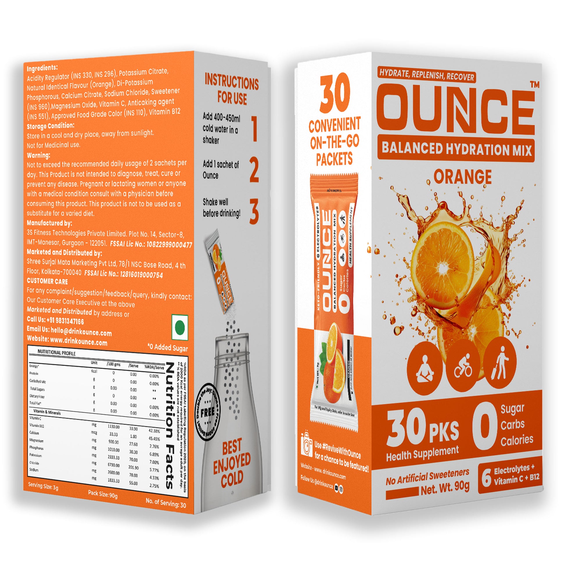 Ounce Electrolyte Powder Sugar Free - 30 Orange Hydration Powder Drink Mix Sachet with 6 Keto Electrolytes no Sugar : Na, Mg, Ca, K, P & Cl boosted with Vitamins B12 & C for Isotonic Energy Drink